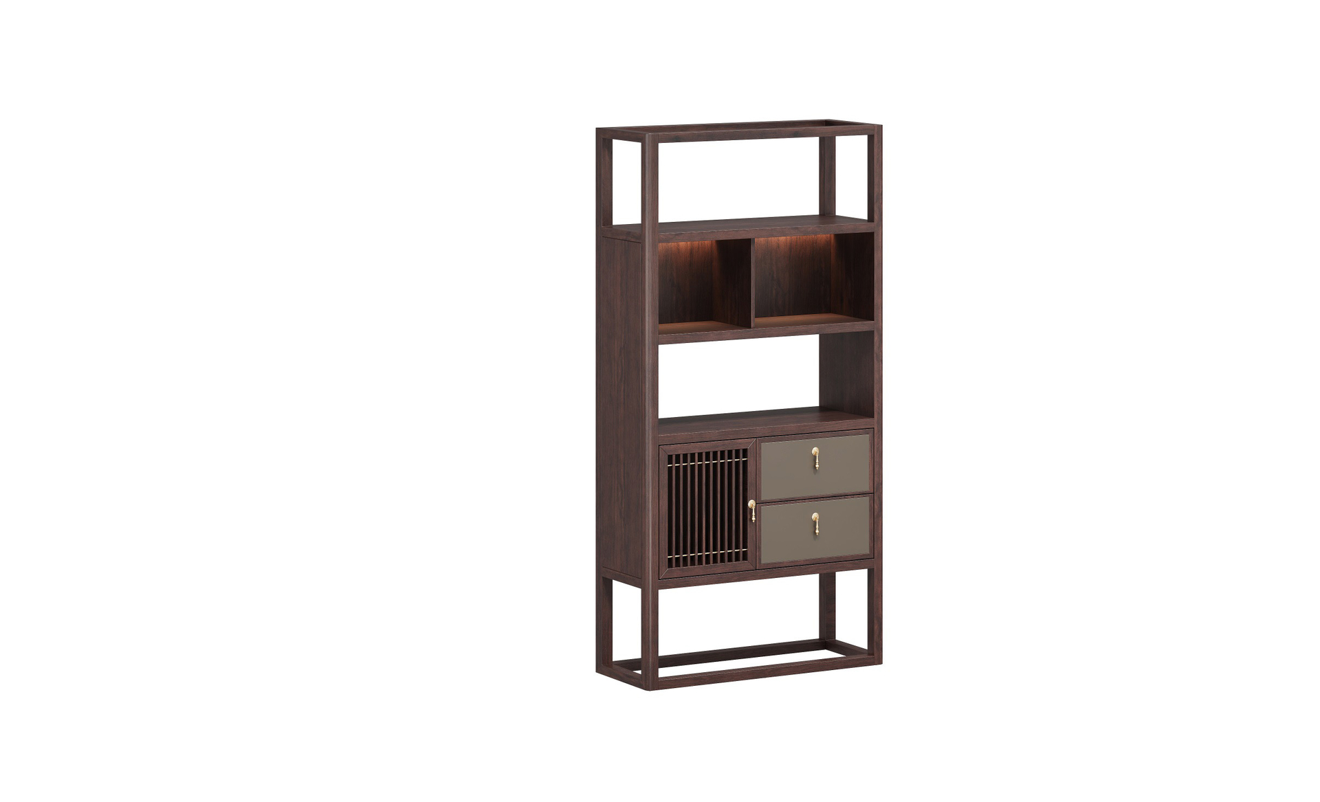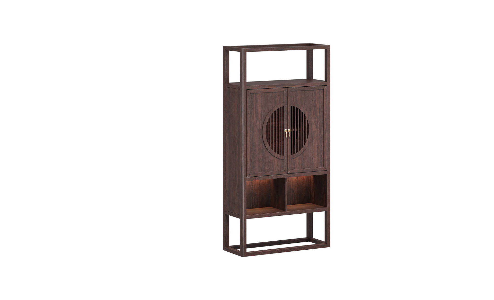 擋板圓型設(shè)計(jì),金銅件裝飾,銅木結(jié)合,鏤空豎條元素的原木柵格設(shè)計(jì),凸顯中式與現(xiàn)代的融合韻味。
