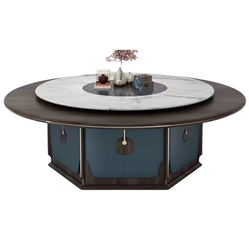 這款12人14人位新中式電動餐桌大圓桌設計簡約大方,符合現(xiàn)代審美,又不失中式傳統(tǒng)的韻味,適合各種場合使用,如家庭、酒店、會所、飯店等。臺面選用選用優(yōu)質(zhì)的實木材料,經(jīng)過多道工藝處理,保持了木材的天然紋理和色澤,結(jié)實耐用,防潮防蛀。餐桌轉(zhuǎn)盤選用大理石巖板,表面光滑平整,耐磨耐刮,易于清潔,不易滋生細菌,環(huán)保健康。