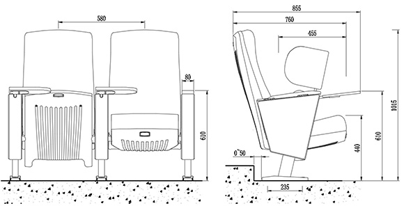2.座椅基本中心距為580±5mm,座包打開(kāi)側(cè)深760±5mm,寫(xiě)字板打開(kāi)側(cè)深855±5mm,基本椅高為1015±5mm,最小排距:900mm。