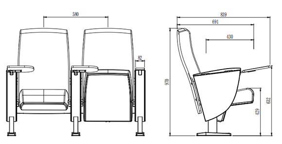 2.座椅基本中心距為580±10mm,座包打開側(cè)深691±10mm,寫字板打開側(cè)深839±10mmm,基本椅高為970±10mm。最小排距:900mm。通過相關(guān)家具產(chǎn)品質(zhì)量檢驗(yàn)中心QB/T2602-2013《影劇院公共座椅》的相關(guān)檢測(cè)依據(jù),甲醛釋放量≤0.120mg/m³h;抗引燃特性符合GB17927.1-2011中的要求。